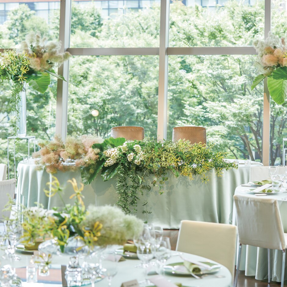 2面を窓に囲まれた会場に溢れる自然光がレセプションに彩りをそえ、爽やかな雰囲気を演出いたします。 -