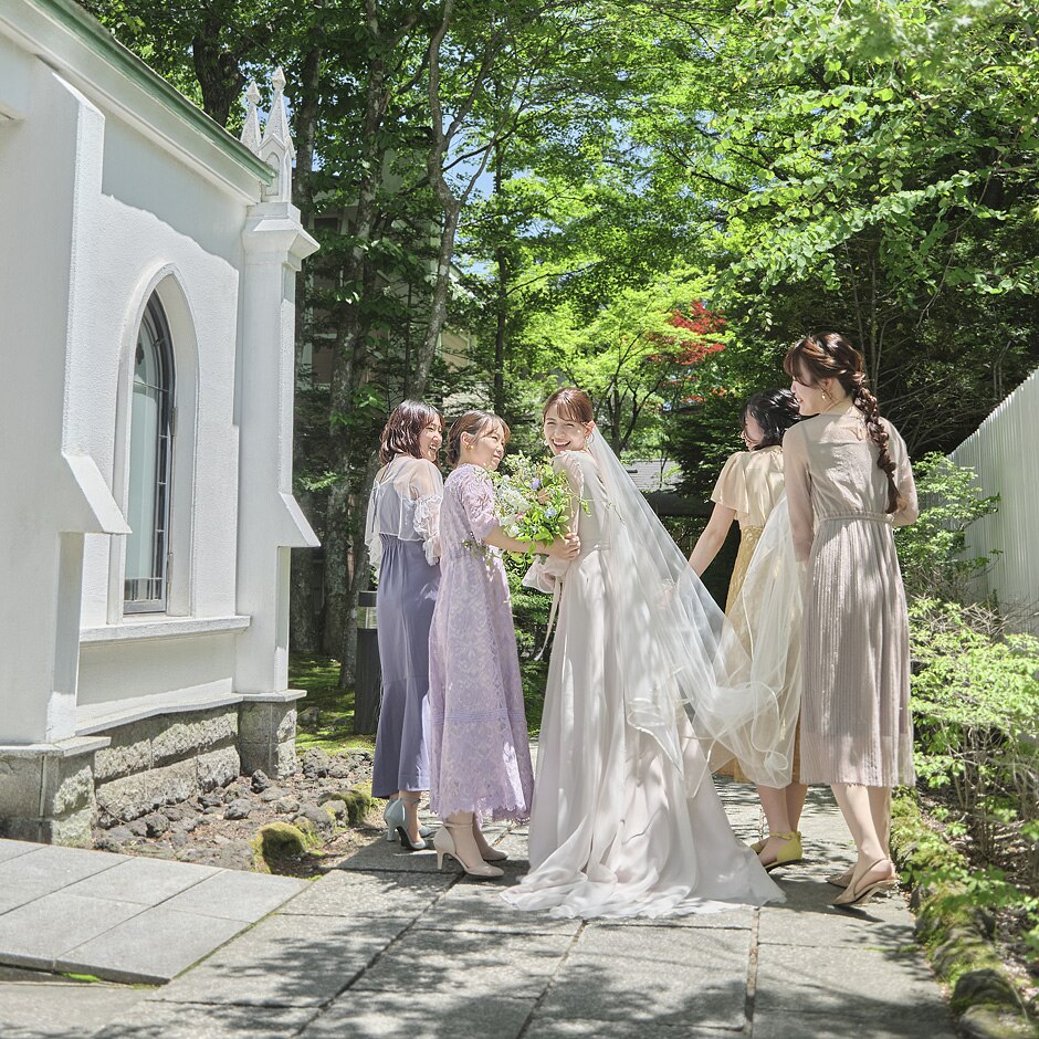 旧軽井沢銀座の奥にひっそりと佇む「ショー記念礼拝堂」ここでの挙式は道行く人々に見守られながらの厳かな英国国教会式。いつまでも二人の故郷としてあり続ける場所です。