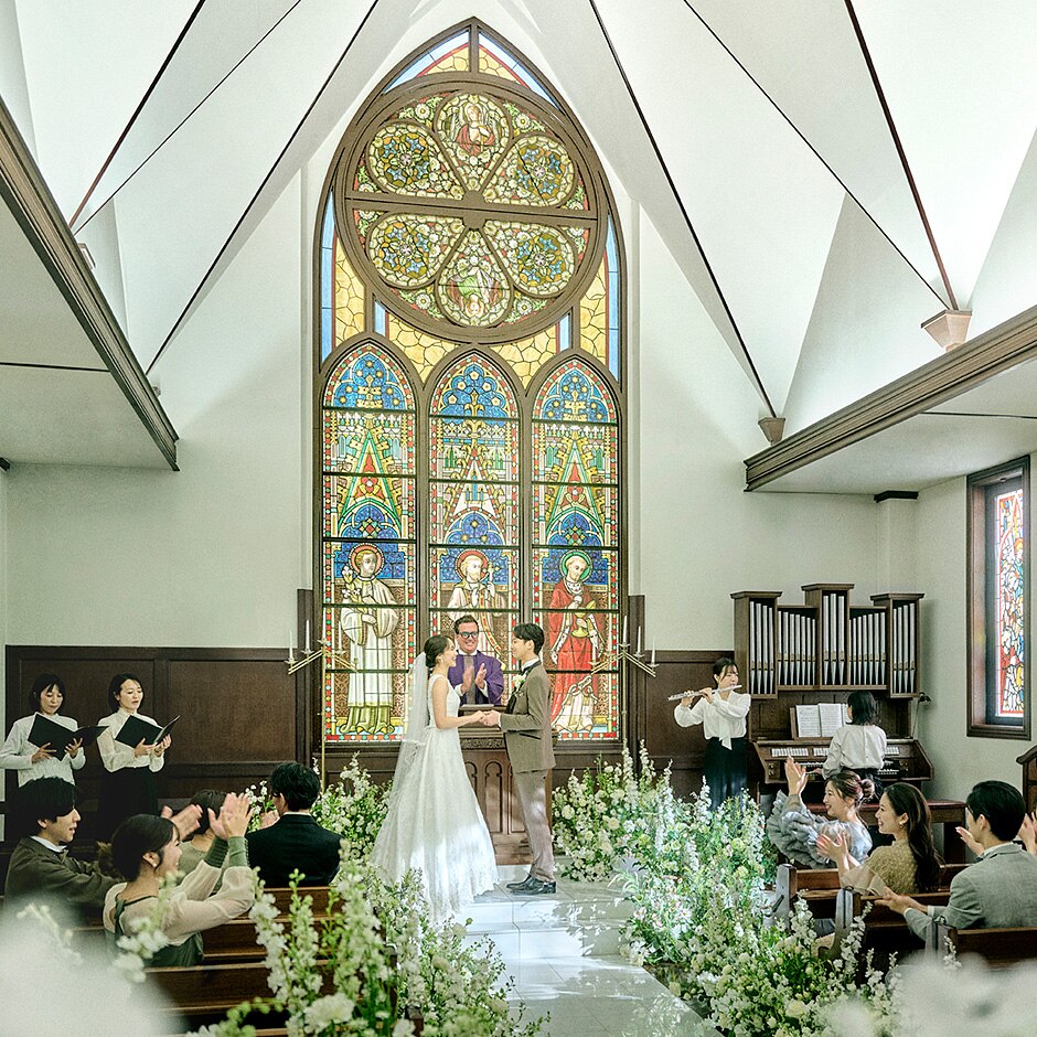 アンティークなステンドグラスの幻想的な光と、パイプオルガンが調和した厳粛なセレモニー。