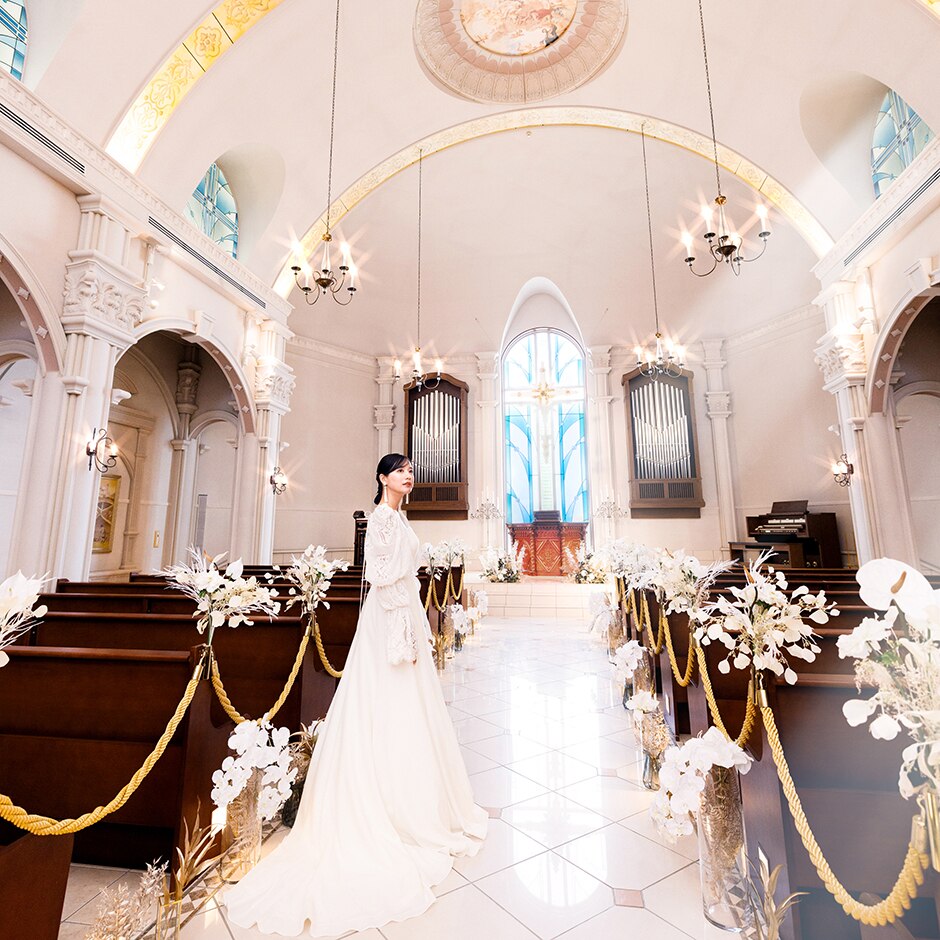天井のフレスコ画や側面のステンドグラス、美しい意匠が印象的な大聖堂。入退場や誓いがよく見える席に多くのゲストが座れるので自然と記憶に残る挙式に。幻想的なランタン演出などを交えたオリジナルの式次第も叶う