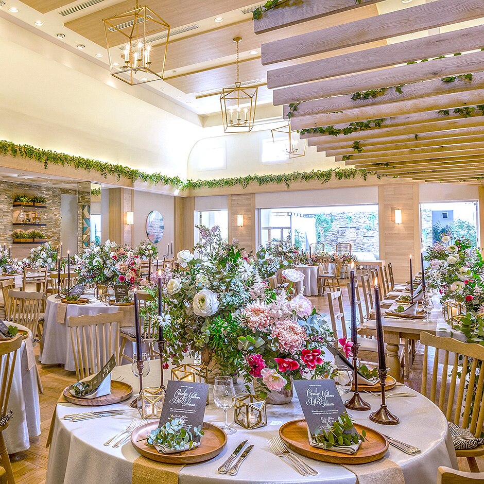 コンセプトは、自然体で自由に過ごす!窓からさし込む光や木のぬくもりを存分に感じる人気のパーティ会場『ブリス』。隣接のテラスは開放的で堅苦しくなくリラックスして過ごせる。オリジナル演出にも期待!