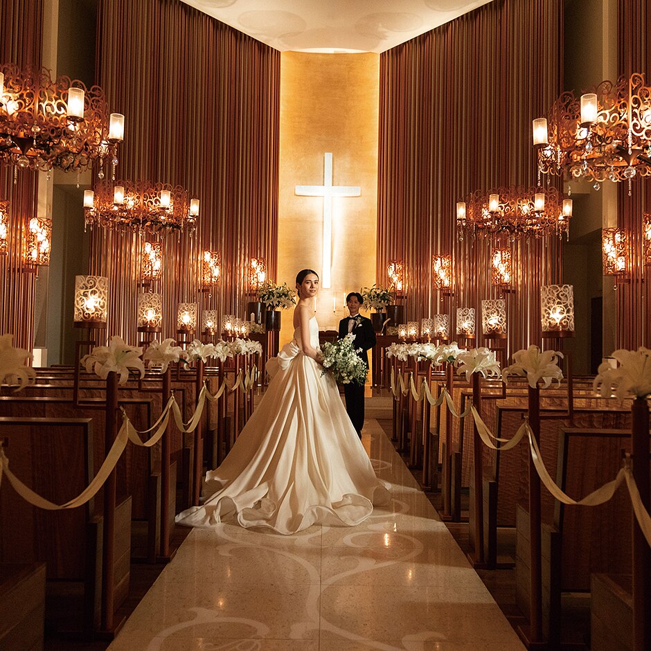 ウエディングドレス姿を世界一美しく魅せるブラウン調チャペルが広がる。大理石が美しい12メートルのバージンロード、10メートルの天井高が広がる、圧倒的なスケール感が非日常の世界へと導いてくれる