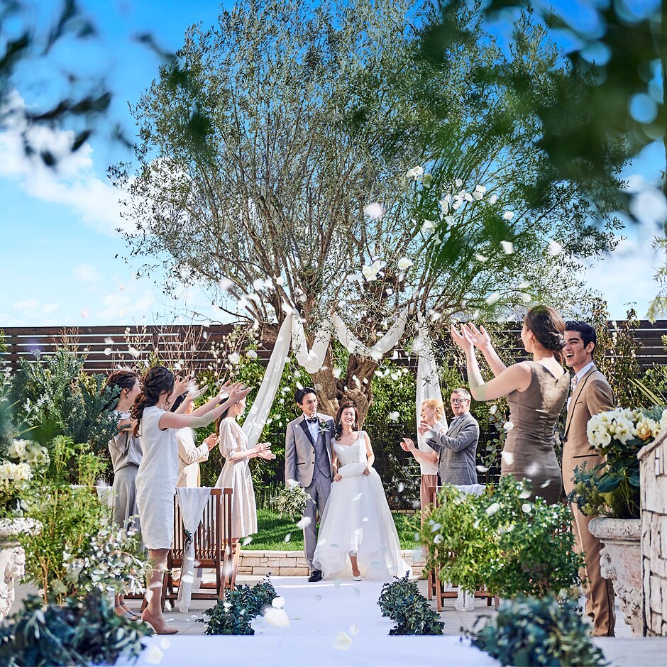 オリーブの樹と共に刻まれる、ふたりの誓い。本物の教会だからこそ、何年経っても帰ってこられるふたりの想い出の場所に。当時と変わらない空間や、木・生花の香りが結婚式を思い出させてくれる