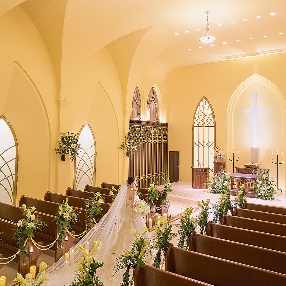 アーチを描いた、あたたかみ溢れる教会。聖歌隊の生演奏が響き渡り、感動の瞬間をより一層美しく彩る
