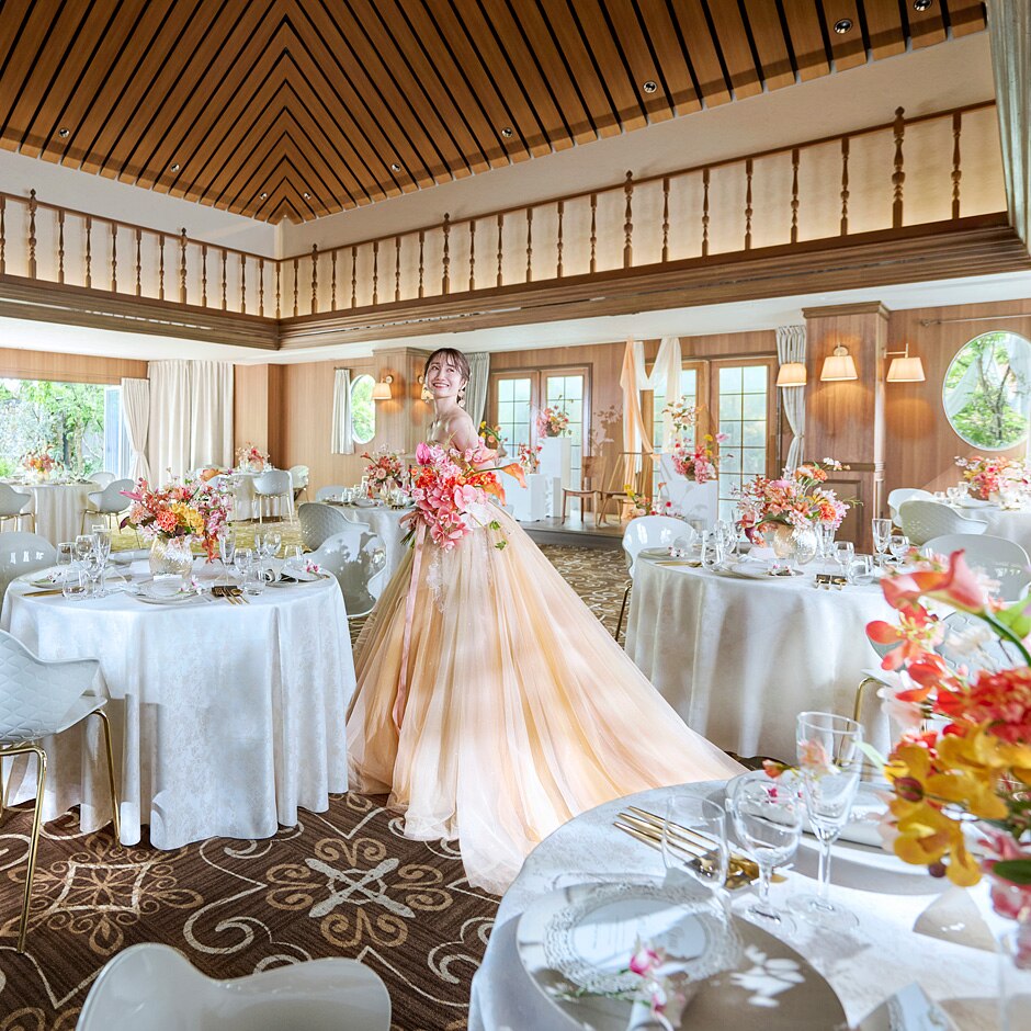 欅の大樹が茂るガーデン、自然光が射し込む邸内、インター至近とは思えない静けさ。開放感抜群の絵になる邸宅は1日1組貸切で、ふたりの世界観にゲストを招き、時間に追われることなくもてなせる。先輩カップルからの信頼が厚い提案力はフェアで確かめよう!
