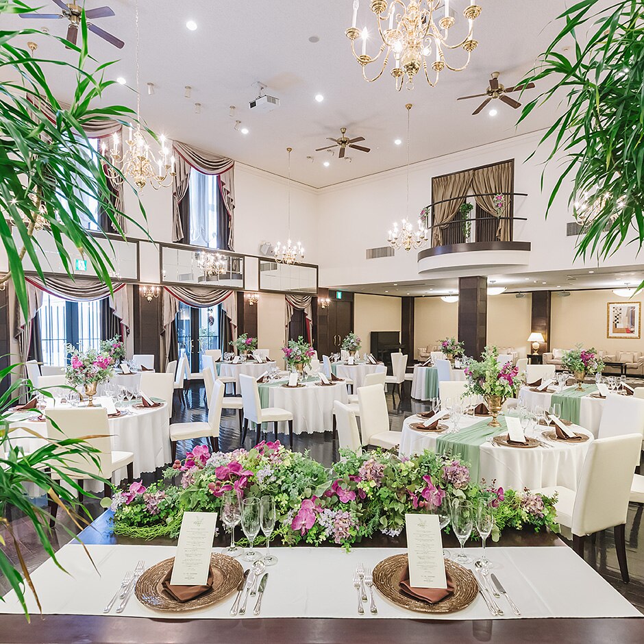 ガーデンに隣接する自然光がさしこむパーティー会場。オーダーメイドでふたりらしくコーディネート -
