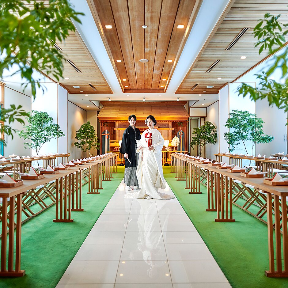 家族や友人などお世話になった人達を呼んで、神前式が行える結婚式場。白無垢や色打掛で結婚式を挙げたいというカップルにおすすめ。