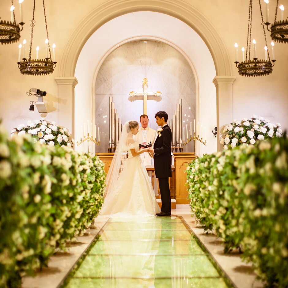 白い薔薇が咲き誇るバージンロードが気品を感じさせるチャペル