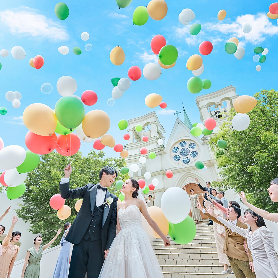 - 【AMフェア参加限定】(1)憧れの大階段でバルーンリリース体験♪(2)プライベートガーデンでおもてなしを体感!ウェルカムパーティー体験