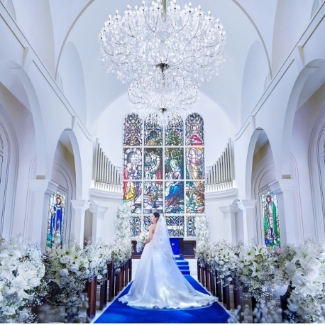 「青」が印象的で美しい教会での入場体験】純白のウェディングドレスが、綺麗に映えるロイヤルブルーのバージンロードは、"他にないような魅力"と花嫁やゲストからの評判も◎。オリジナル人前式や善光寺式も承り可