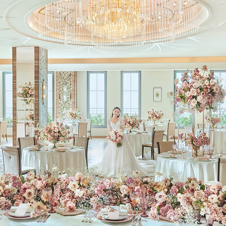 シャンデリアの輝きと、咲き誇る花々が彩る空間。ふたりのためだけに用意された幸せに満ちた祝宴を叶えて