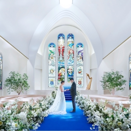 ◆挙式料特典(36万円相当)◆【天井高11m×長さ20mのチャペル】永遠を意味するロイヤルブルーのバージンロードを歩き、愛を誓う。特別な時間が過ごせるとSNSで話題!この感動をフェアで体感してみて!