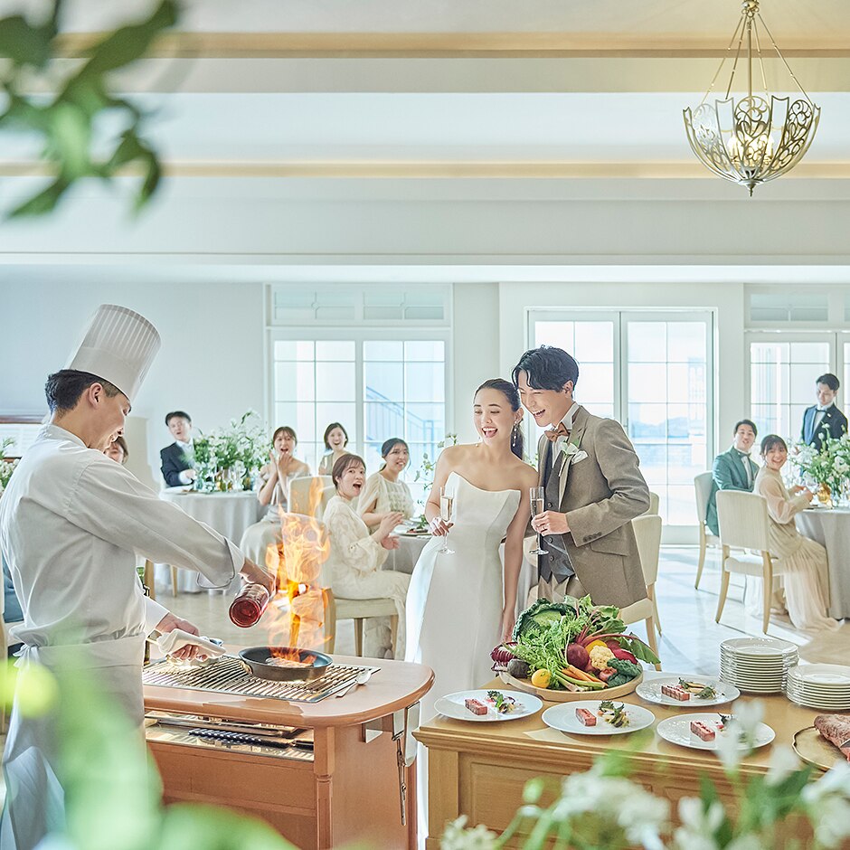 婚礼料理は、厳選食材を使った和フレンチがおすすめ。目の前での料理演出は、ゲストの五感を刺激し、料理への期待も高めてくれる。また、専属パティシエによる最旬スイーツは幅広い年齢層のゲストに好評