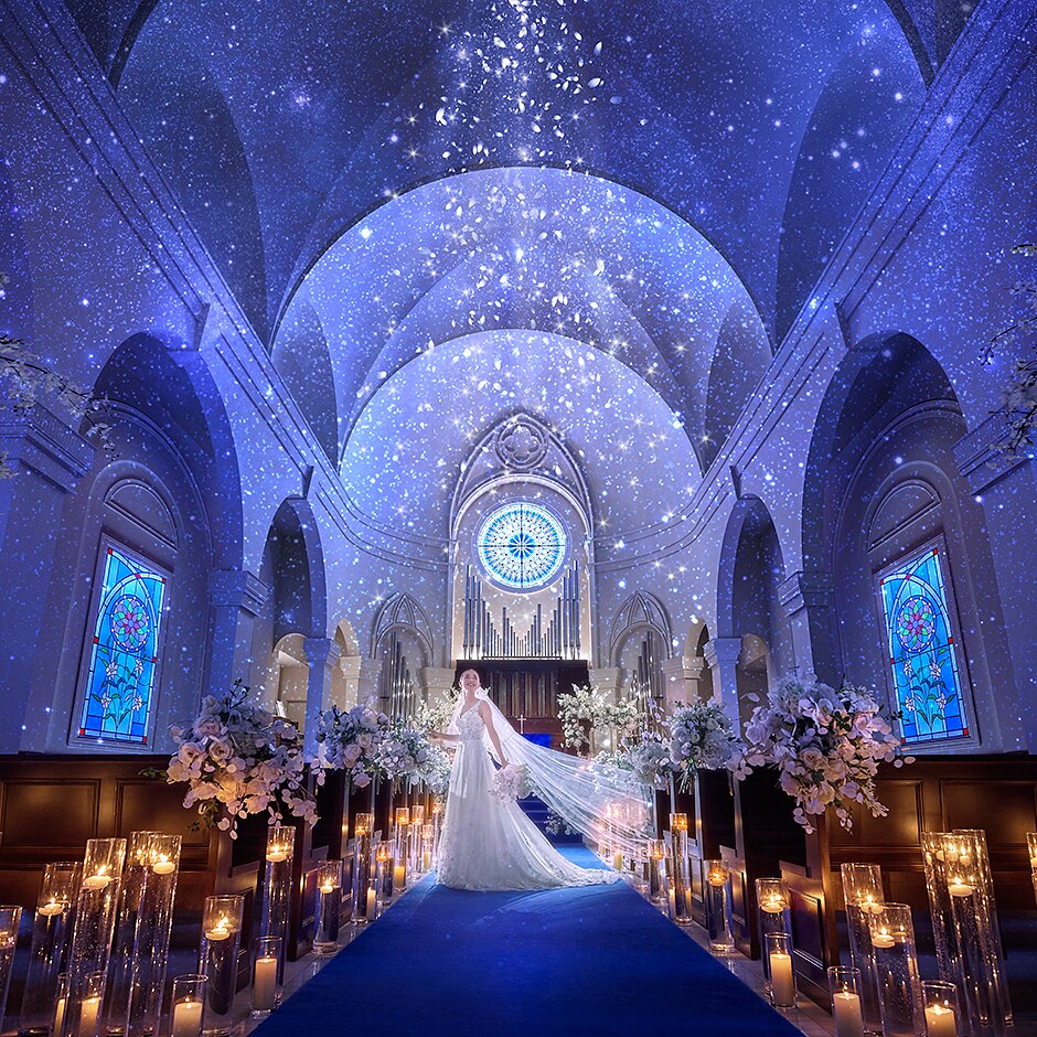 白亜の空間が、満天の星がちりばめられたような幻想的な空間になる。前撮りにもおすすめのワンシーンに