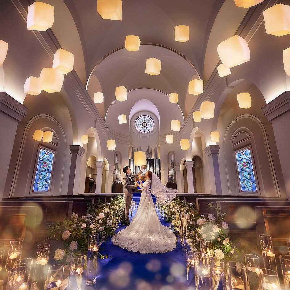 挙式会場(純白が映えるロイヤルブルーの大聖堂)