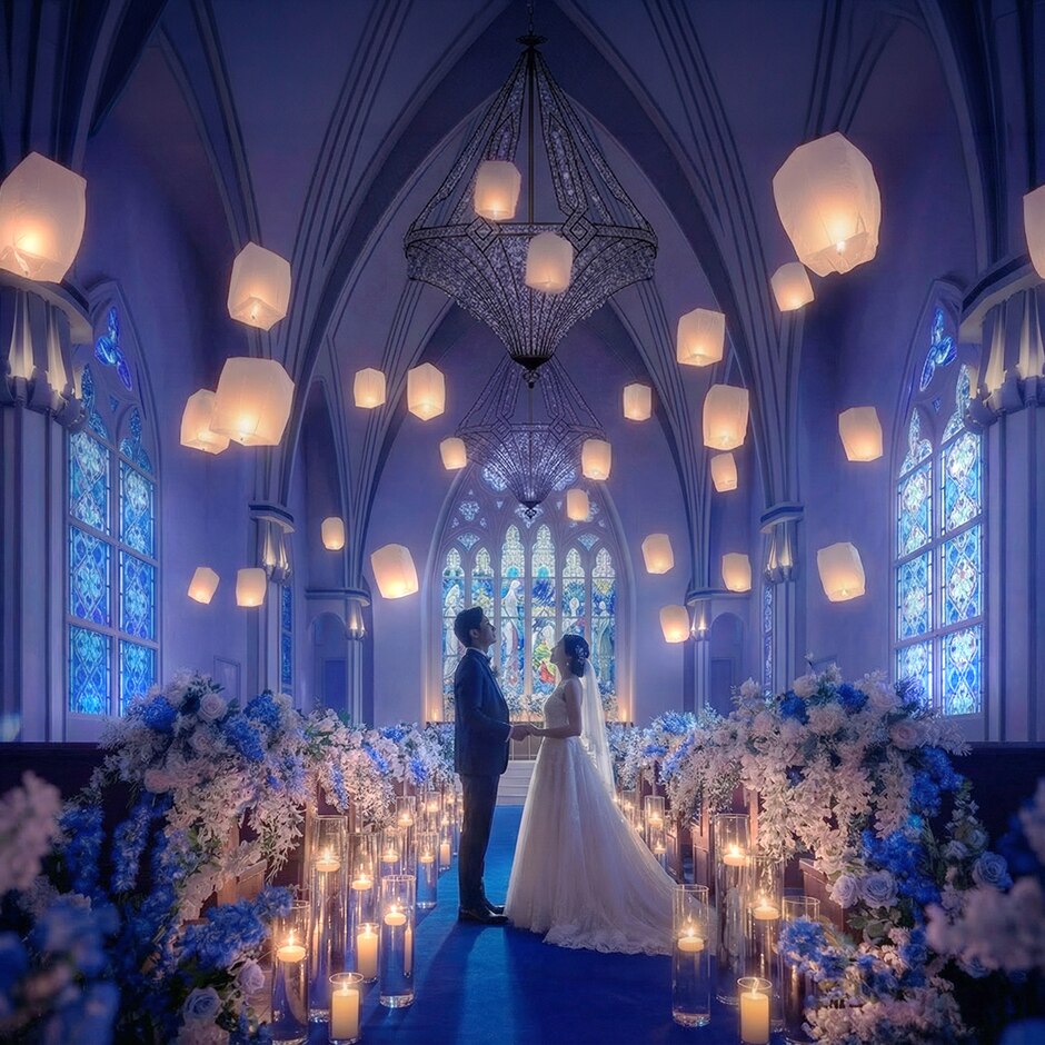 大きなステンドグラスからブルーの光が差し込む幻想的なチャペル