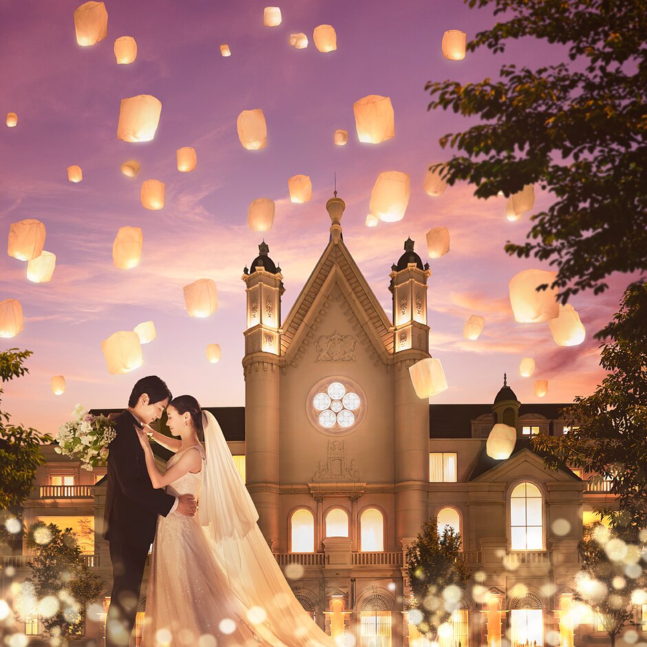 幼い頃に憧れたお城そのものの外観が、花嫁の心を掴んで離さない同館。夕暮れ時にはイルミネーションで彩られより幻想的な雰囲気に。昼夜と時間によって変わる世界観はふたりとゲストを一層たのしませてくれる