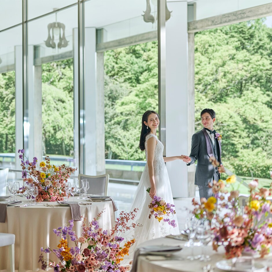 天井まで一面ガラス張りの会場は、屋根付きのテラスと広大なガーデンを併設。多彩な空間とたっぷり3時間のプログラムで、ゲストと存分にふれあえる。絶景を眺めながら、季節のこだわりフレンチを味わう贅沢な時間を