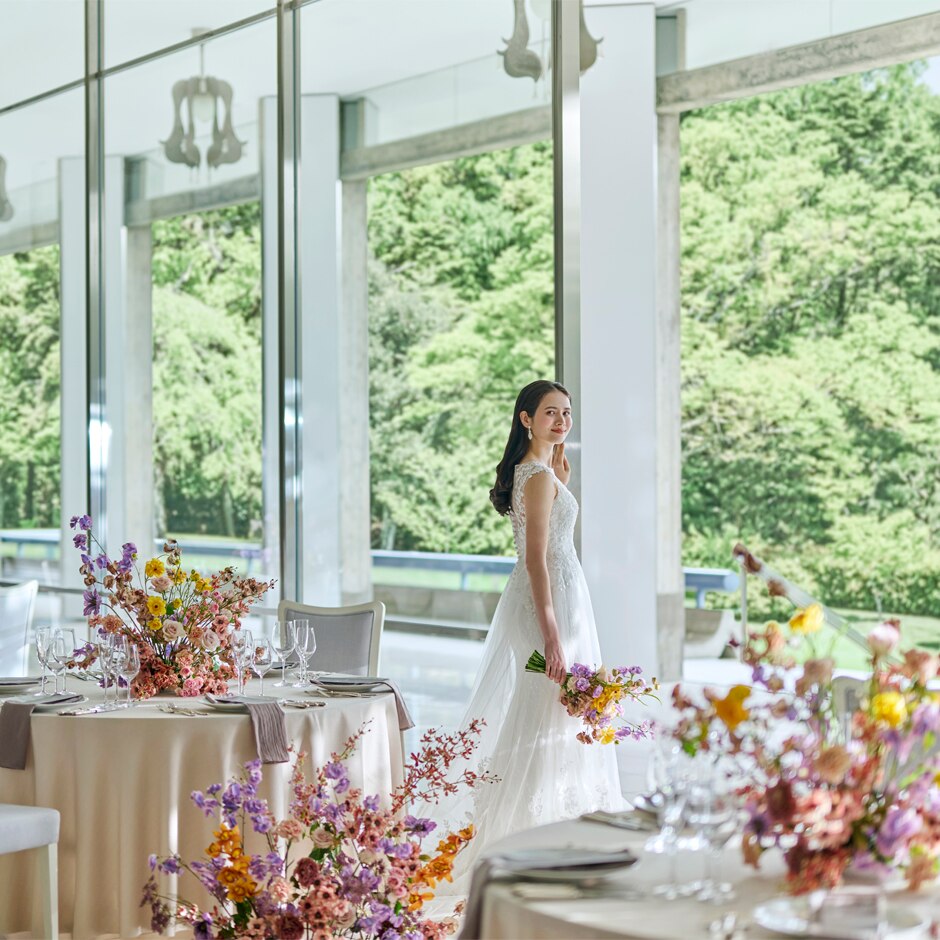 天井まで一面ガラス張りの会場は、屋根付きのテラスと広大なガーデンを併設。多彩な空間とたっぷり3時間のプログラムで、ゲストと存分にふれあえる。絶景を眺めながら、季節のこだわりフレンチを味わう贅沢な時間を
