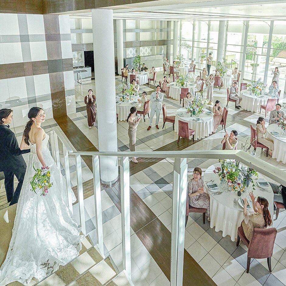 ゲストの視線がふたりに集まる入場シーンを素敵な演出にしてくれる大階段。ゲストからの祝福を受け止めよう