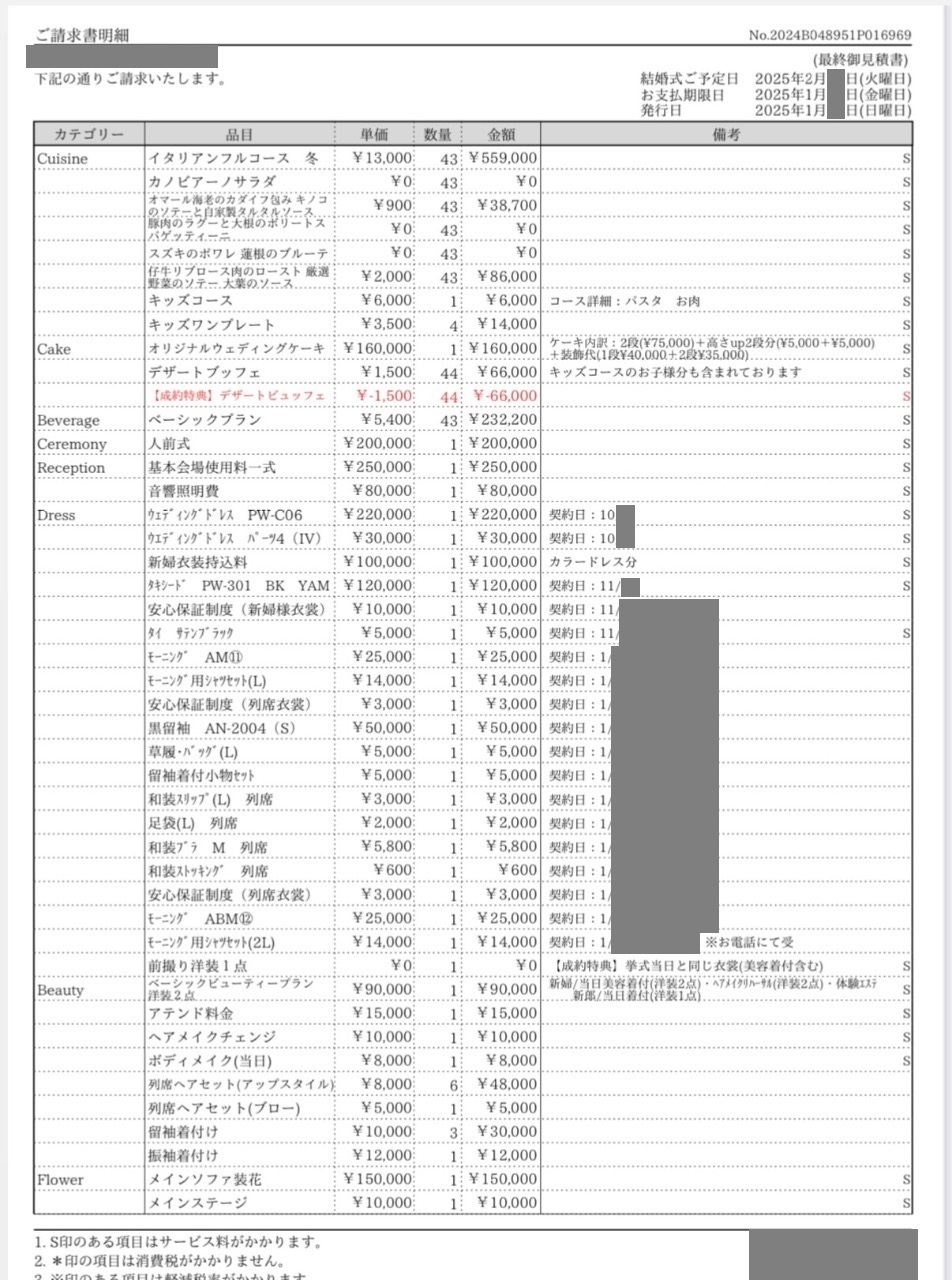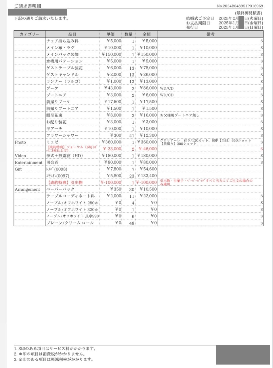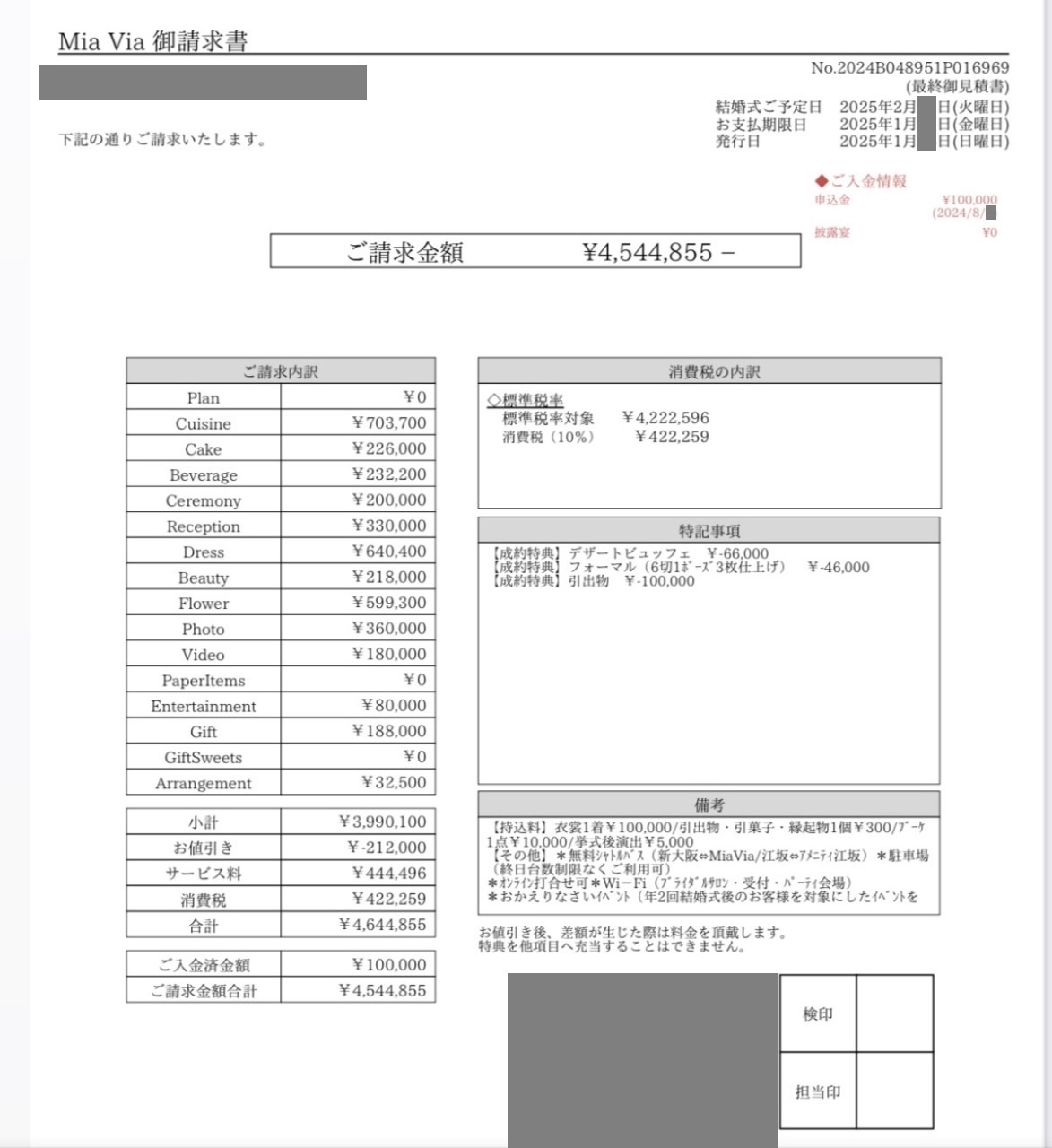 ※投稿された金額情報は、日取り、申込みのタイミングや会場の空き状況等によって異なるため、最終費用明細の項目や金額をもとにした、式場との価格交渉や追加サービス等の要望はご遠慮ください。