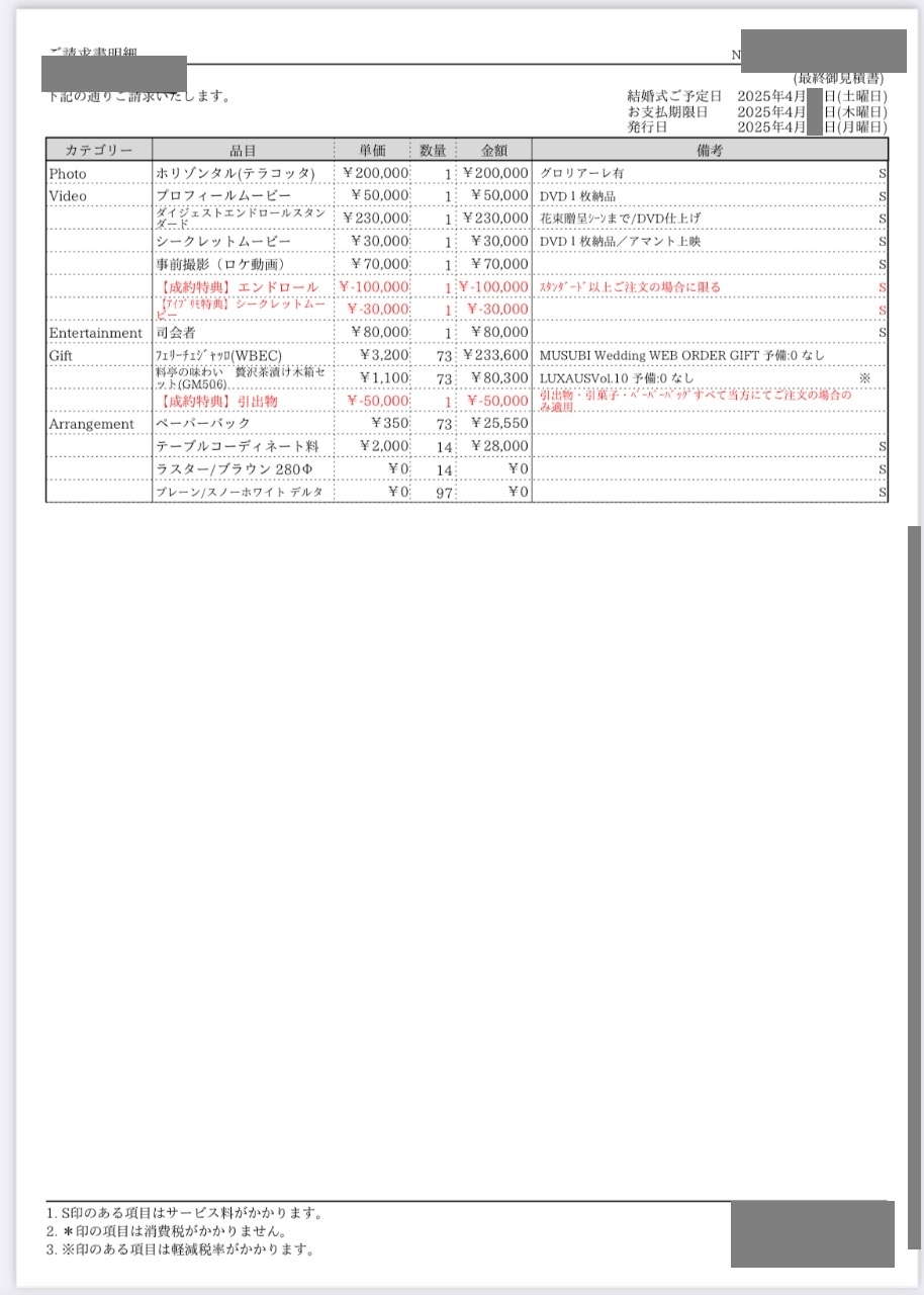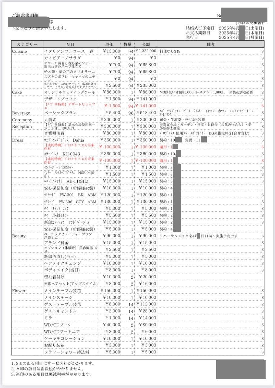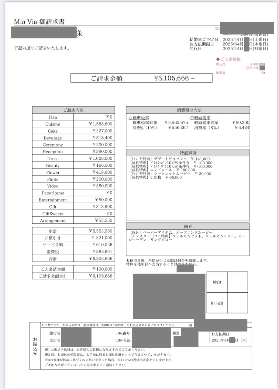 ※投稿された金額情報は、日取り、申込みのタイミングや会場の空き状況等によって異なるため、最終費用明細の項目や金額をもとにした、式場との価格交渉や追加サービス等の要望はご遠慮ください。
