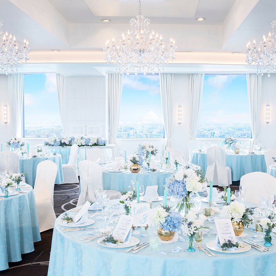 天井が高くホテルらしい上質感に溢れたパーティ会場「ザ・グランコート」、地上120mにあるフロア貸切会場「クリスタルルーム」、モネの『睡蓮(レプリカ)』が飾られたモダンな「ローズルーム」などから選べる