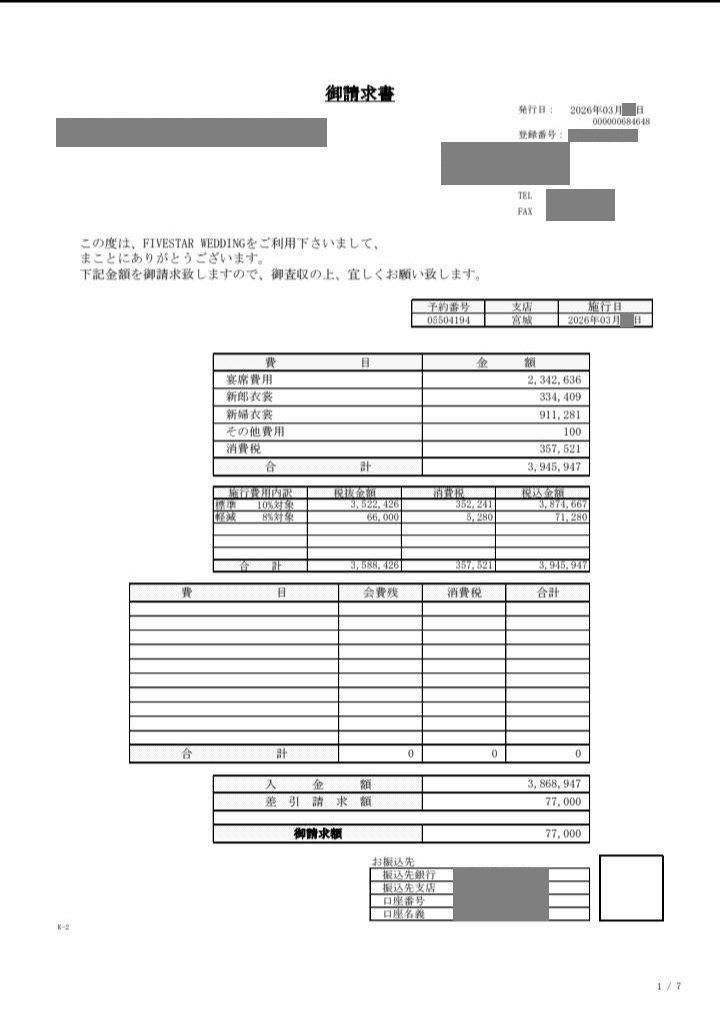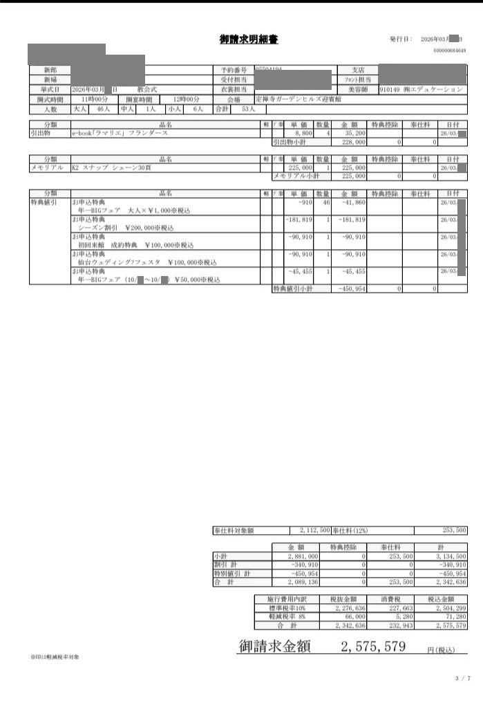 ※料金実例では申込金などを含む会場に支払った"総額"を表示しています。また、料金明細画像の項目名をもとに独自の基準で分類しています。