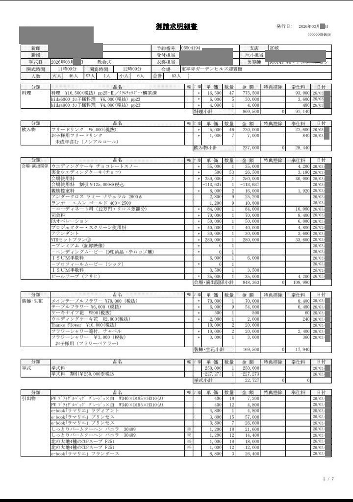 ※投稿された金額情報は、日取り、申込みのタイミングや会場の空き状況等によって異なるため、最終費用明細の項目や金額をもとにした、式場との価格交渉や追加サービス等の要望はご遠慮ください。
