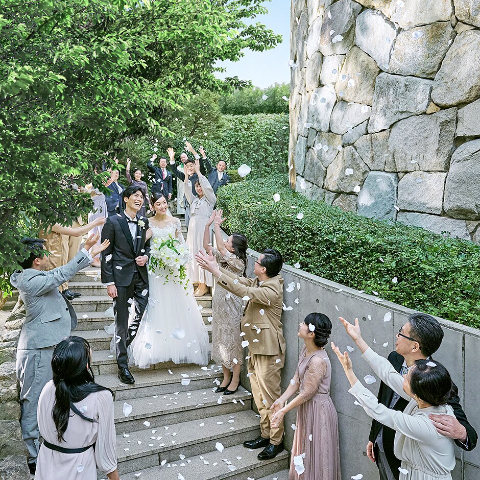 神聖な挙式の後は、庭園でフラワーシャワー。解放感ある空間に緊張も解け、笑顔溢れる時間に