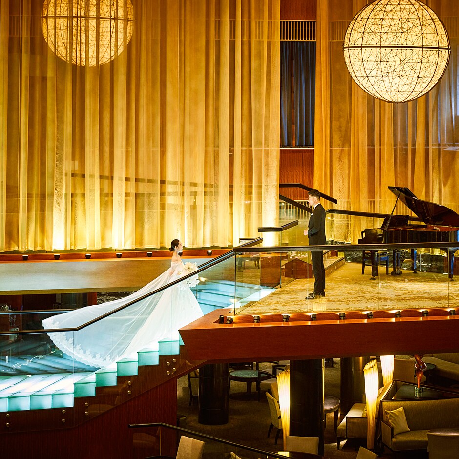 ラグジュアリーなメインロビーに響くピアノの生演奏が非日常の始まりを優雅に告げる。館内には気品漂うデザインが広がり、ドレスのトレーンが映える大階段など、絵になるスポットが随所に。特別な一日を過ごして。