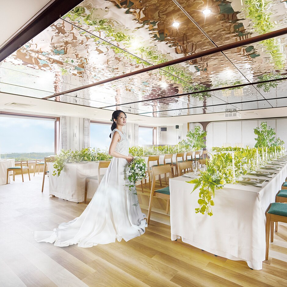 ホテルらしい品格のある会場は、ホワイト×グリーンのナチュラルなコーディネートも、くだけすぎず上品に魅せる