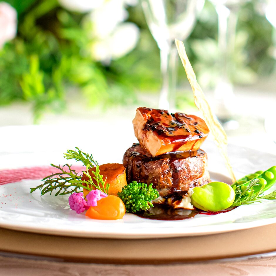 シェフ自らが食材の買い付けに行くなど、すべての素材を吟味した料理。希少性の高いブランド牛も使用し、グルメなゲストにも喜ばれている。ゲストのアレルギー対応のほか、お肉のカットサイズなどにも柔軟に対応。