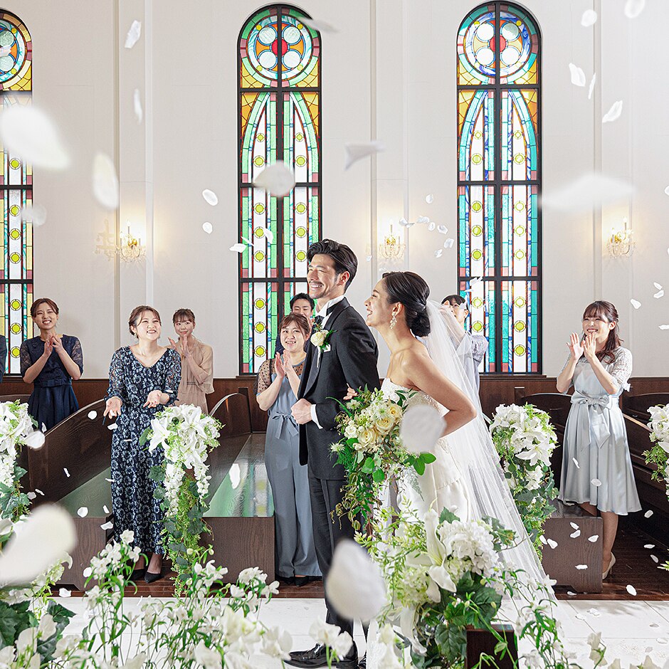ステンドグラスが鮮やかに輝く白の空間。150名着席の広々とした造りで、ゲスト一人ひとりにゆったりと参列してもらえるのが嬉しい。式後はチャペル前の大階段で、たくさんの祝福に包まれるフラワーシャワーを満喫