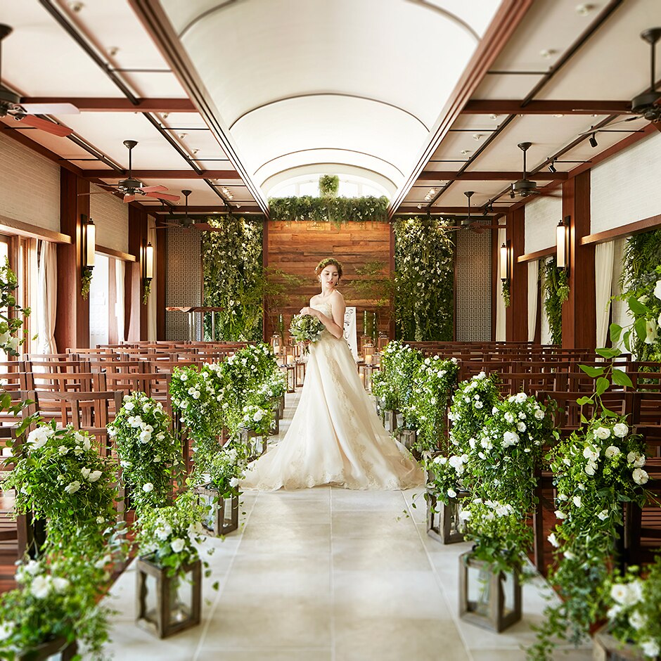 大聖堂での厳かな誓いの後は、大階段で映画のワンシーンのような祝福の演出を。他にも、木の温もりに包まれるナチュラルテイストのチャペルや、緑溢れるガーデンチャペルなど、多彩なセレモニースペースが揃う