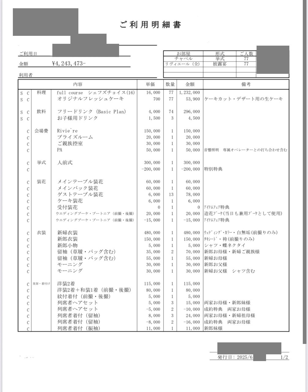 挙式・控室料・席料・会場費