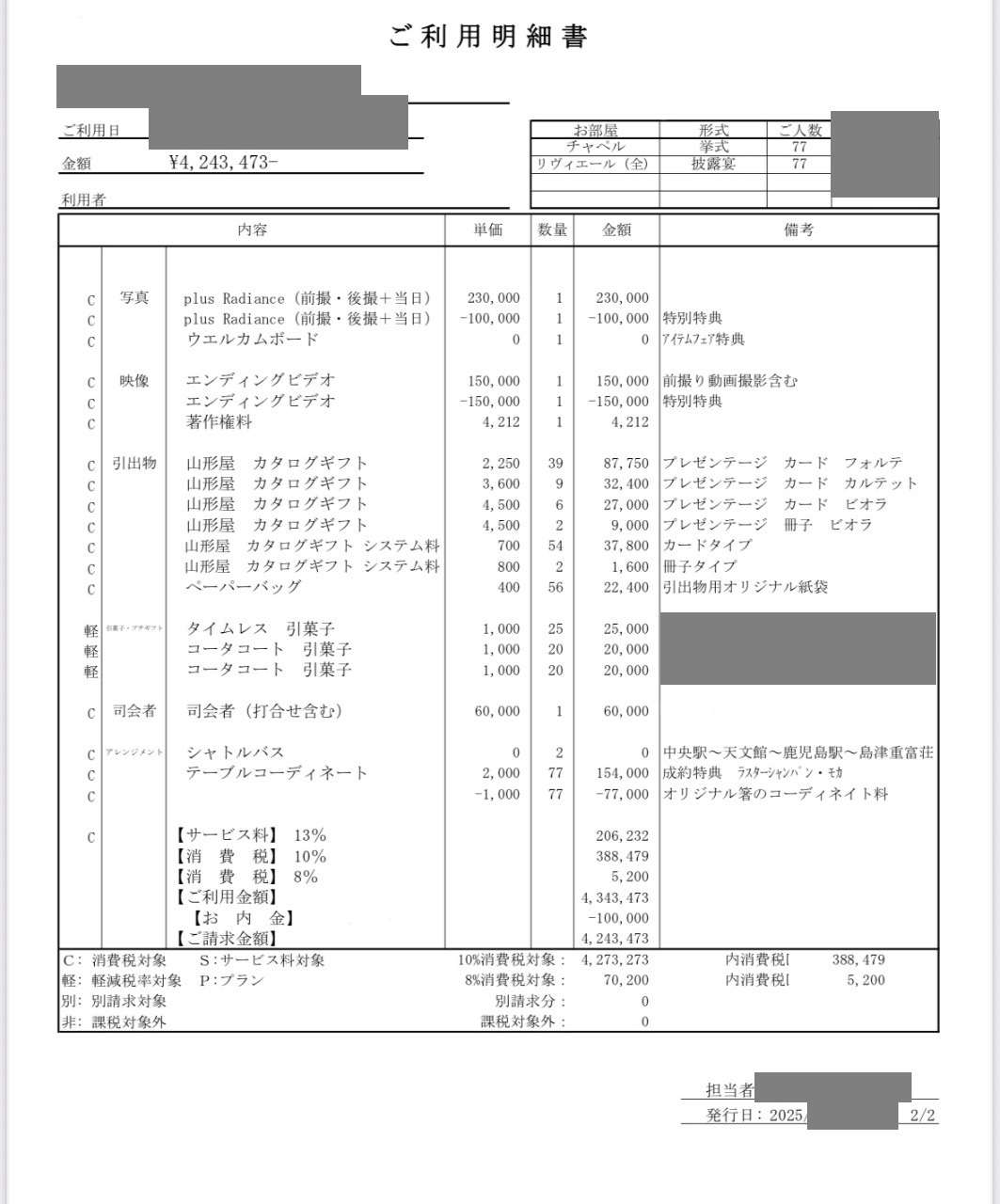 ※料金実例では申込金などを含む会場に支払った"総額"を表示しています。また、料金明細画像の項目名をもとに独自の基準で分類しています。