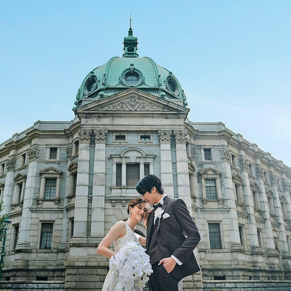 趣のある街並みをバックに前撮りもおすすめ。クラシカルな雰囲気の中、大切な一枚を残そう。
