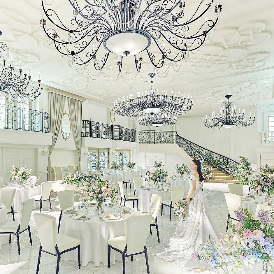 会場を美しく輝かせるシャンデリアと、15段ある螺旋の大階段の存在感を放つ上質なパーティ空間。白を基調としたシンプルながら高級感が溢れる空間を、ふたり好みのコーディネートで会場全体を彩って。