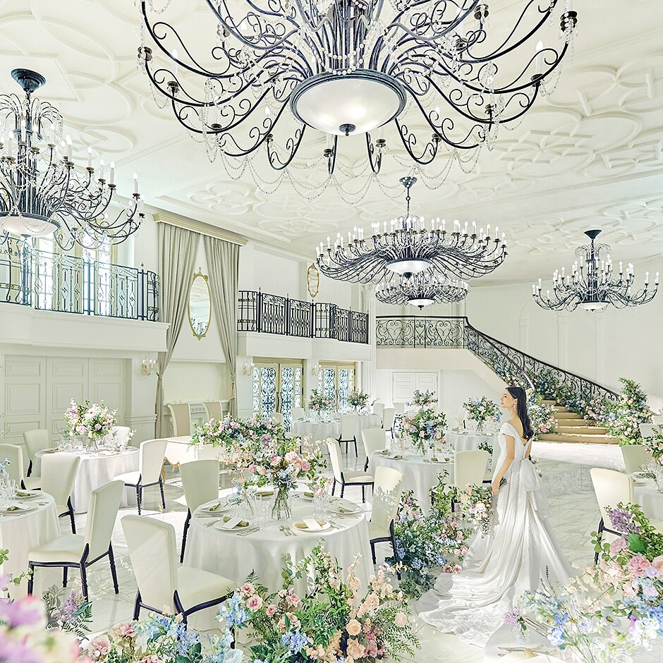 シャンデリアと階段が印象的!花嫁姿が美しく映える白基調の会場