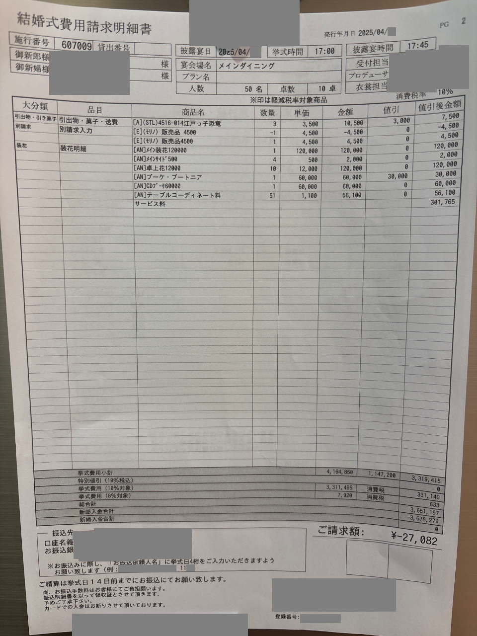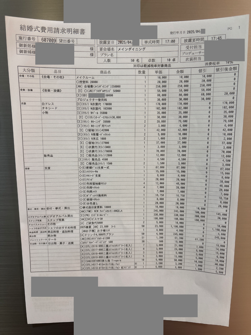 ※投稿された金額情報は、日取り、申込みのタイミングや会場の空き状況等によって異なるため、最終費用明細の項目や金額をもとにした、式場との価格交渉や追加サービス等の要望はご遠慮ください。