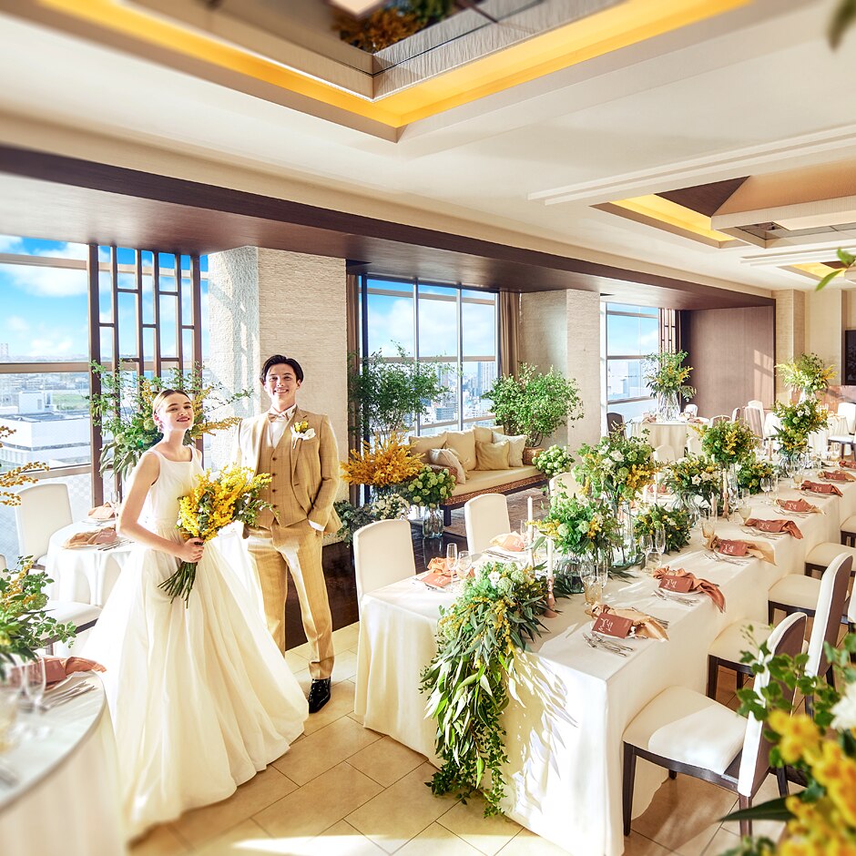 一面の大きな窓で開放感抜群のパーティ会場。最上階からの眺望も楽しめるくつろぎのウエディングを