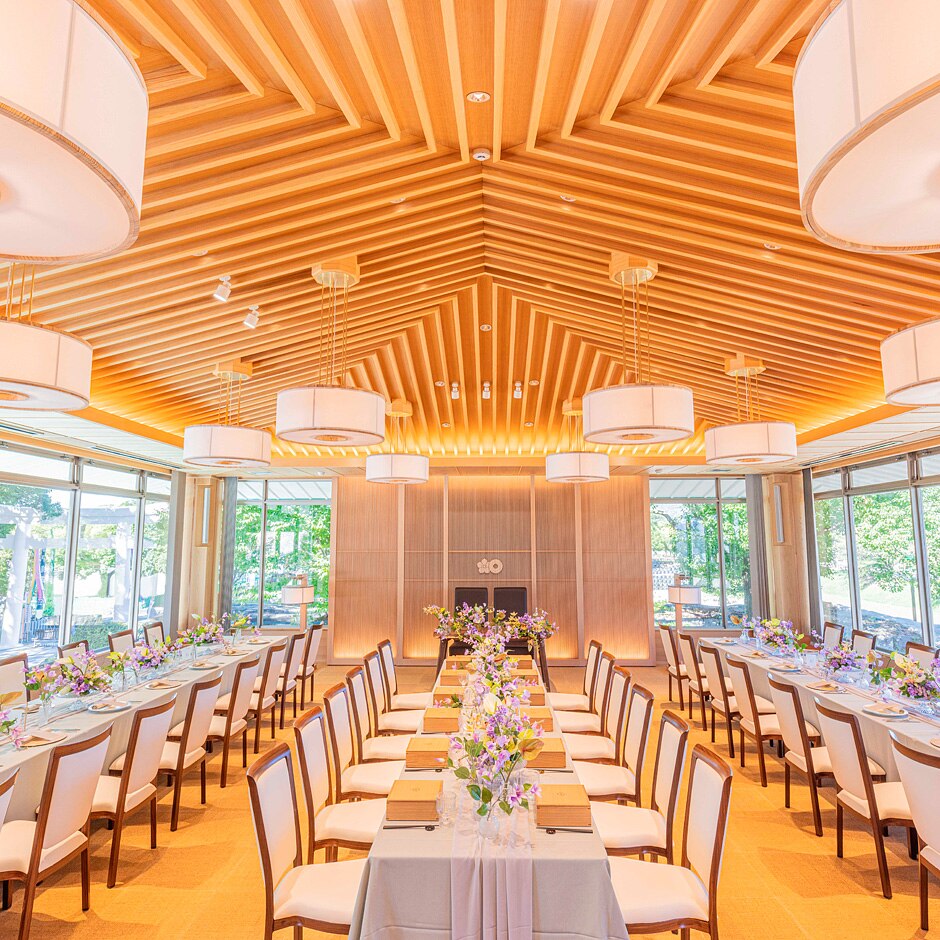 - 加藤神社の境内にある披露宴会場。由緒ある神社で本格的な神前式を執り行え、挙式後は境内内の会場へすぐ移動!大切なゲストの移動の負担が軽くなると好評