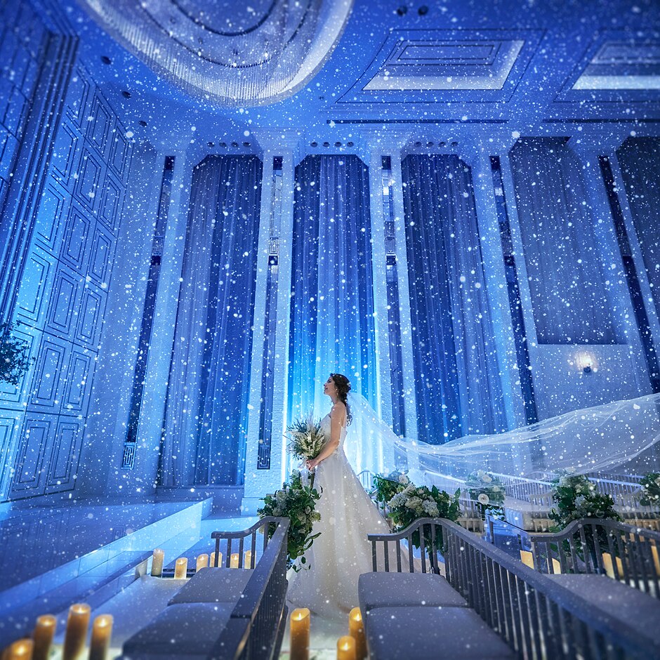 【クリスタルチャペル】オリジナルの演出でチャペルも二人の好みの空間に演出ができる。幻想的な星空は好評 -