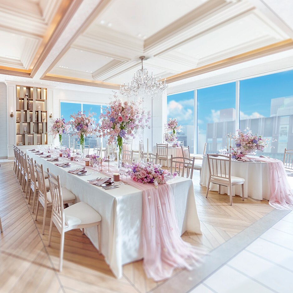 2面の窓から光が降り注ぐ開放感抜群のパーティ会場。ふたりらしく洗練されたコーディネート空間で上質なひと時を過ごして。