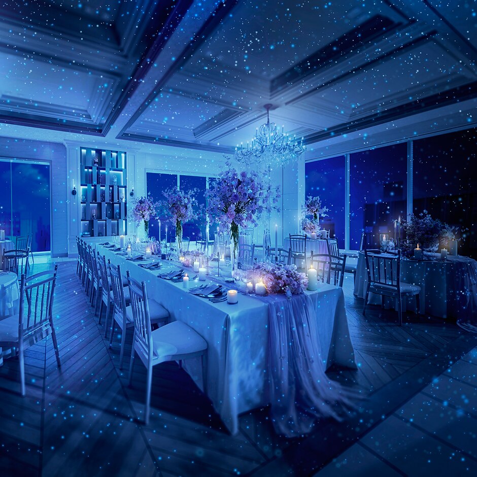 【クリスタルチャペル】オリジナルの演出でチャペルも二人の好みの空間に演出ができる。幻想的な星空は好評 -