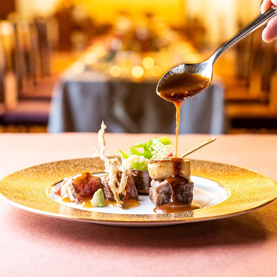 A5ランク牛肉や比内地鶏など、シェフ自ら厳選した県産食材を季節に合わせて提供。コース料理を自由に組み立てられるプリフィックススタイルを採用しているので好みのメニューを選んでゲストをもてなそう。