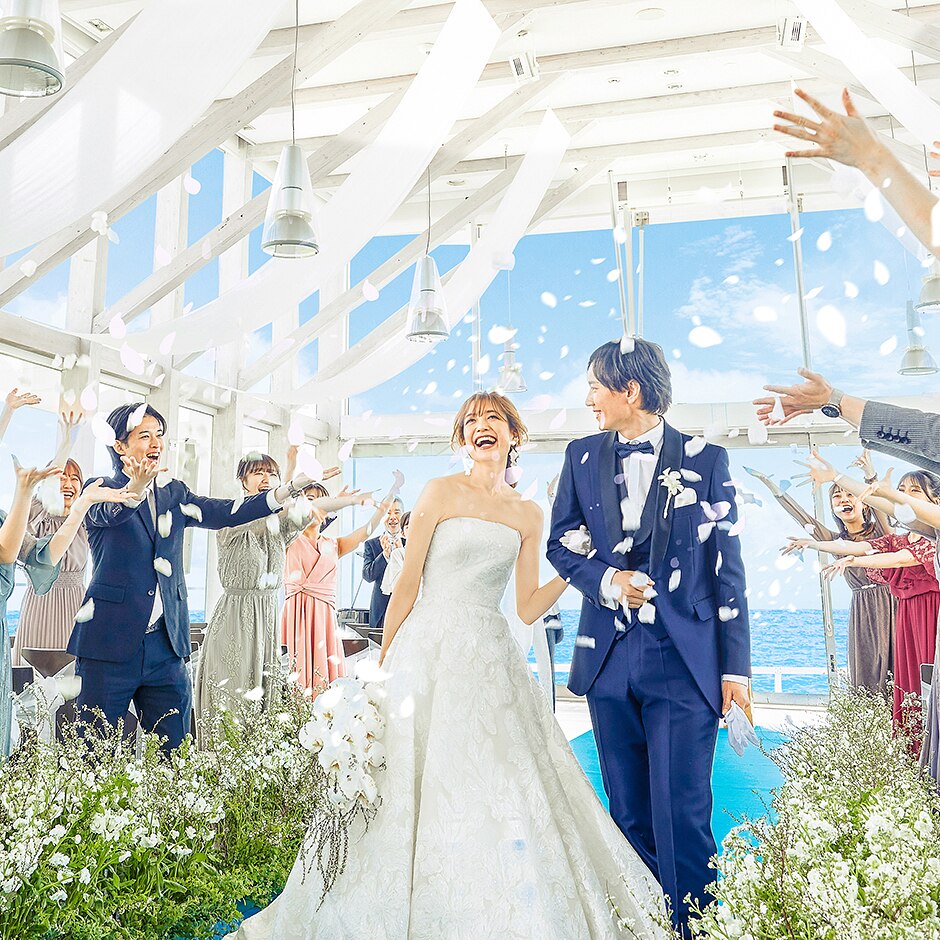 遥かに広がる空と海に祝福されるような開放感の中、誓いの瞬間に合わせて真っ青な海と空が姿を現す驚きの演出が。圧巻のパノラマオーシャンビューが目の前に広がり、参列者全員の記憶に刻まれる。