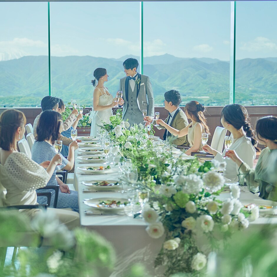甲府昭和ICより車で1分の好立地。挙式を行うチャペルは圧巻のステンドグラスでゲストを一気に非日常へ引き込んでいく!座席数が多く、ゆったりと座れて新郎新婦の姿が見えやすいのも魅力。高層階のバンケットで五感で楽しめる料理でのおもてなしも必見!