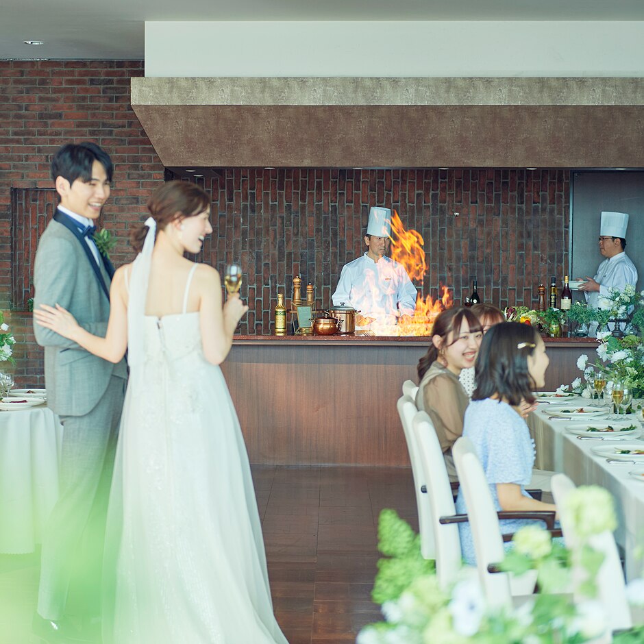 料理も花嫁の声を基に一新し続けている。料理でおもてなしができるよう、ゲストの目の前で調理をし -